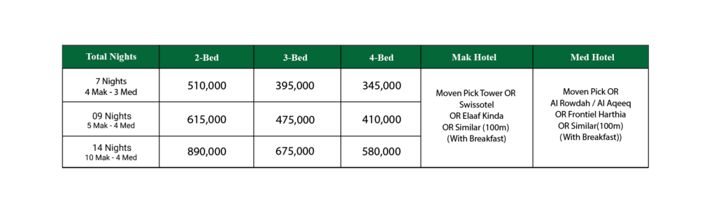 Private Car for Complete Trip (Mak-Med Or Med-Mak), Car (Upto 03 Pax) SR: =600/- H-1(Upto 07 Pax), SR: =700/- (Upto 07 Pax), SR: =1,850/- (GMC) SR: 1000/- & HIACE SR: =900/- (Upto 10 Pax) without Ziyarats. If Required